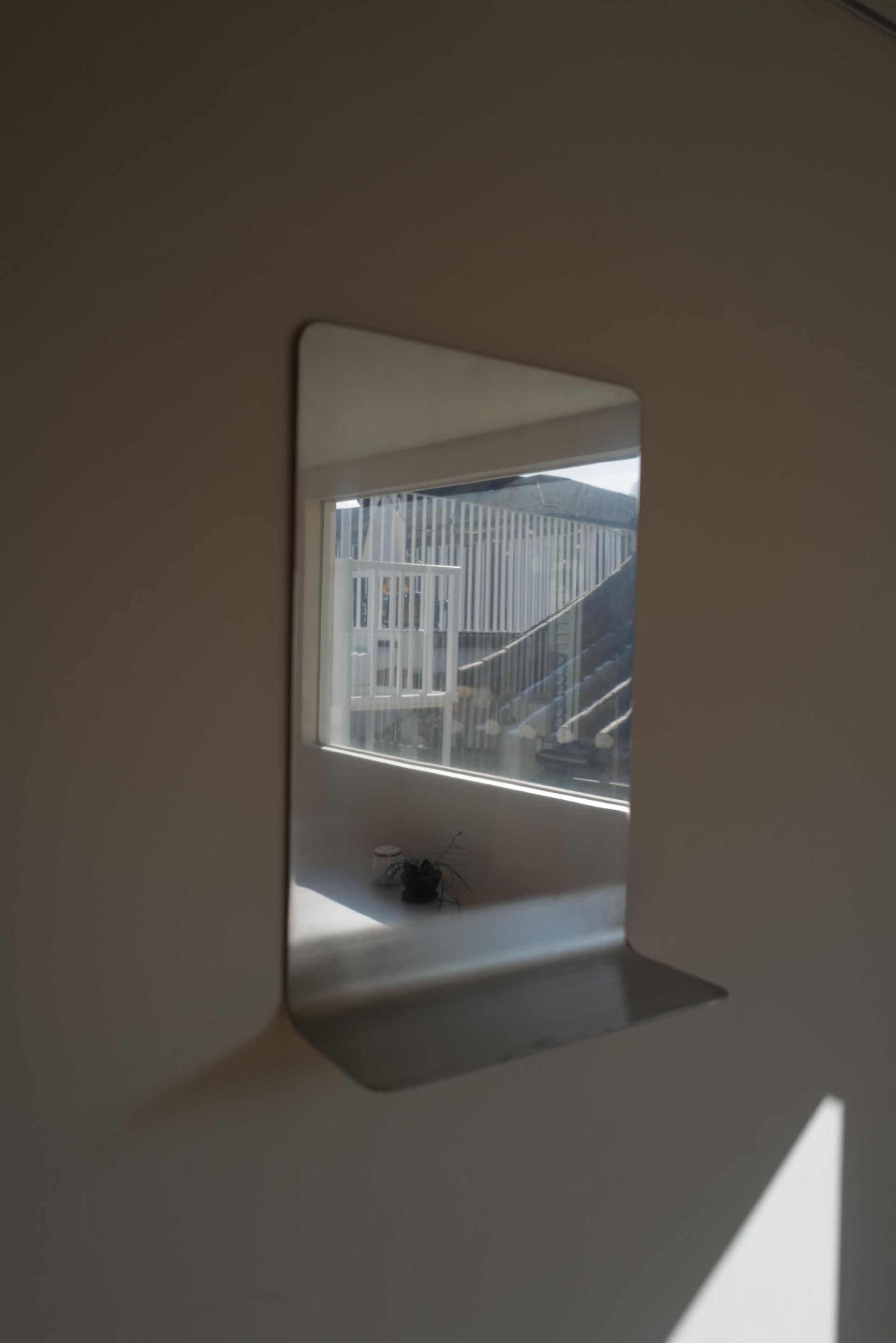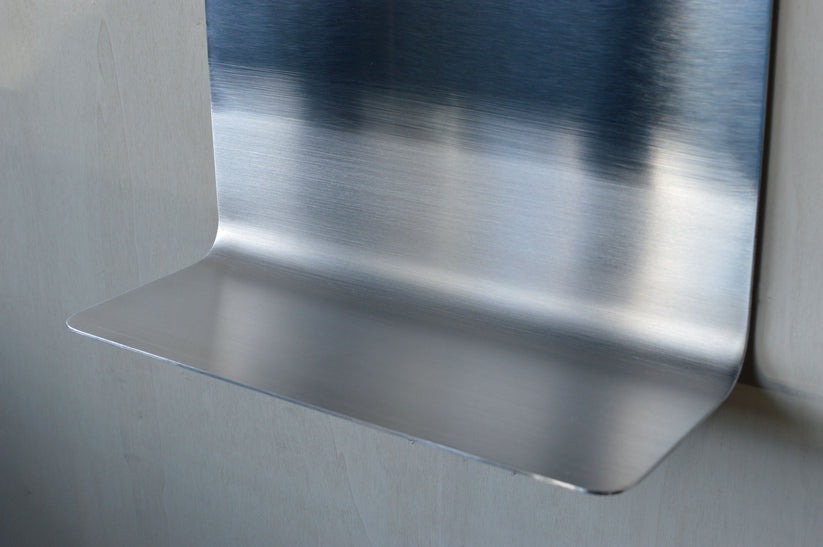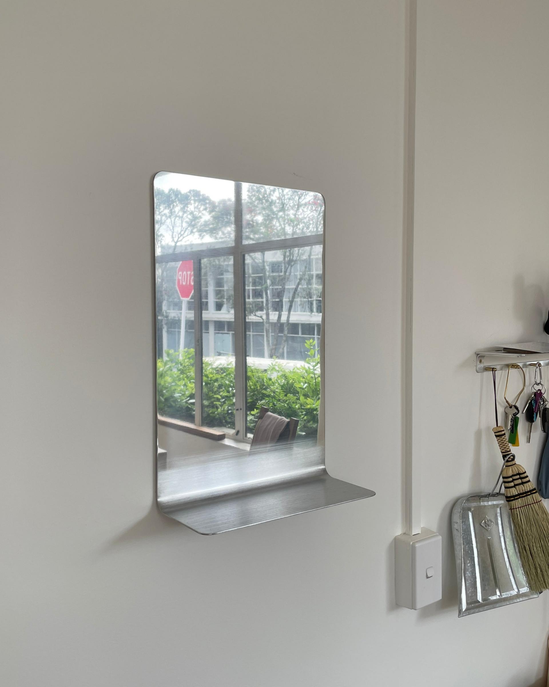 거울 부분의 알루미늄은 광택 처리가 되어 있으며, 하단부 수납 부분은 광택이 나지 않게 투톤 처리되어 있습니다.