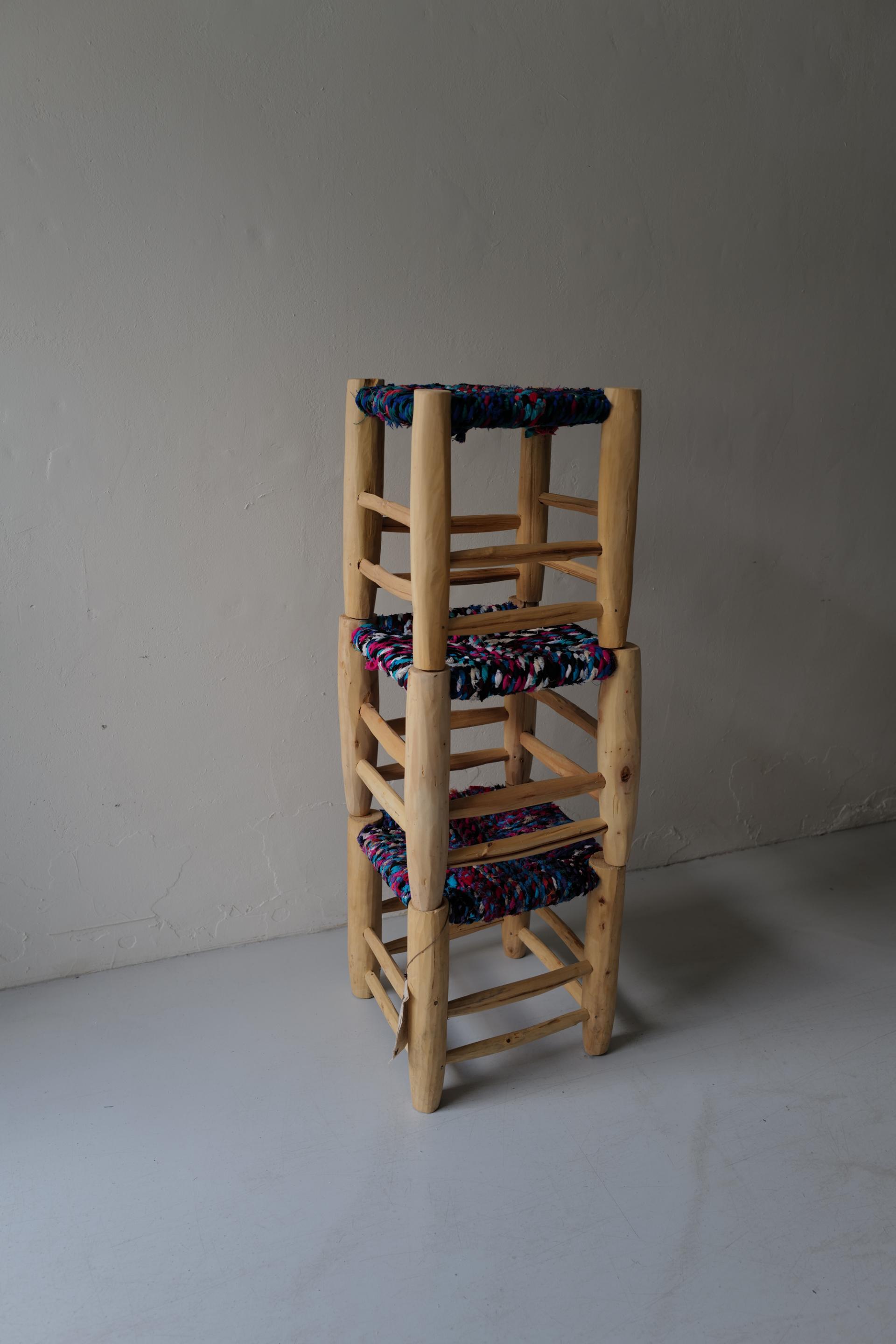 모로코의 전통 패브릭으로 엮은 오렌지 우드 스툴입니다.