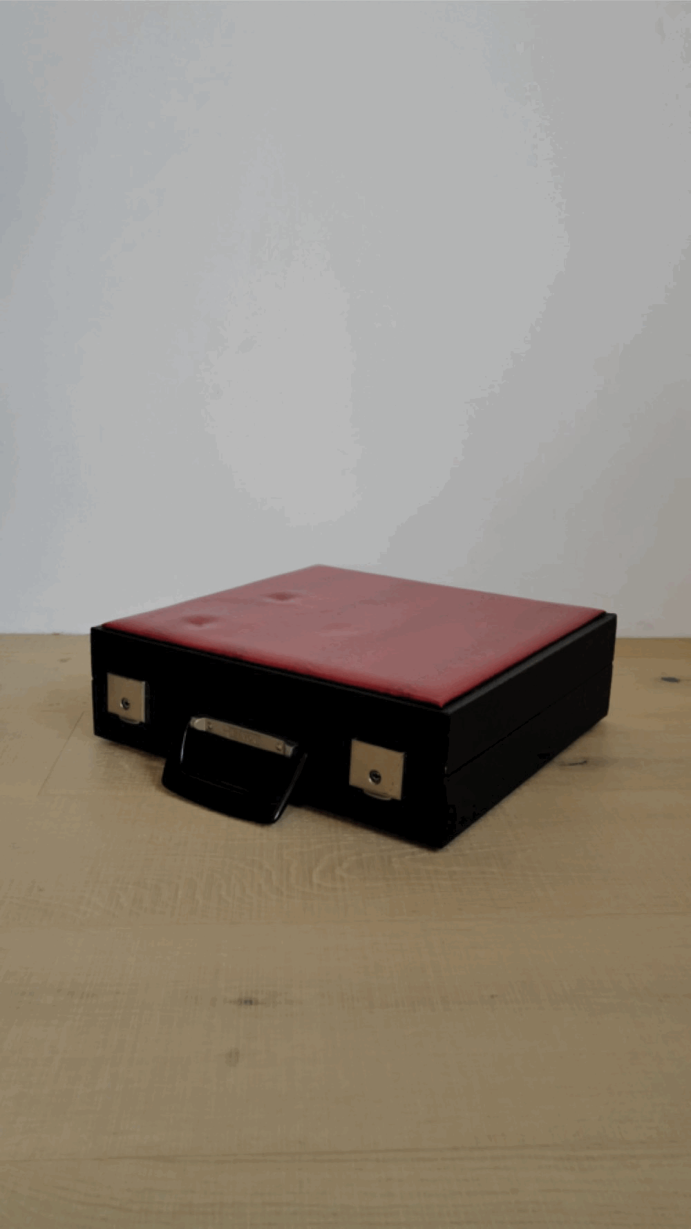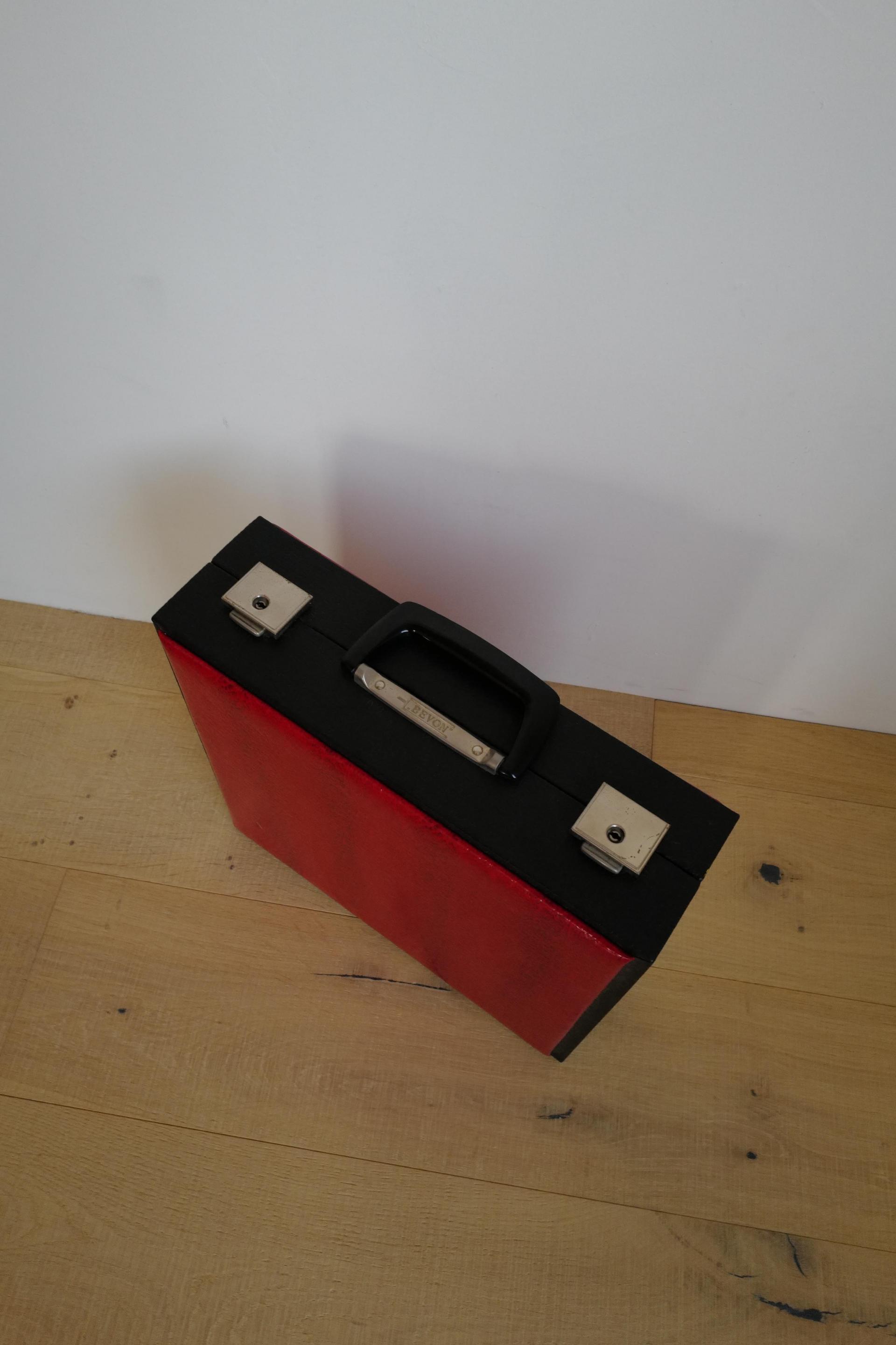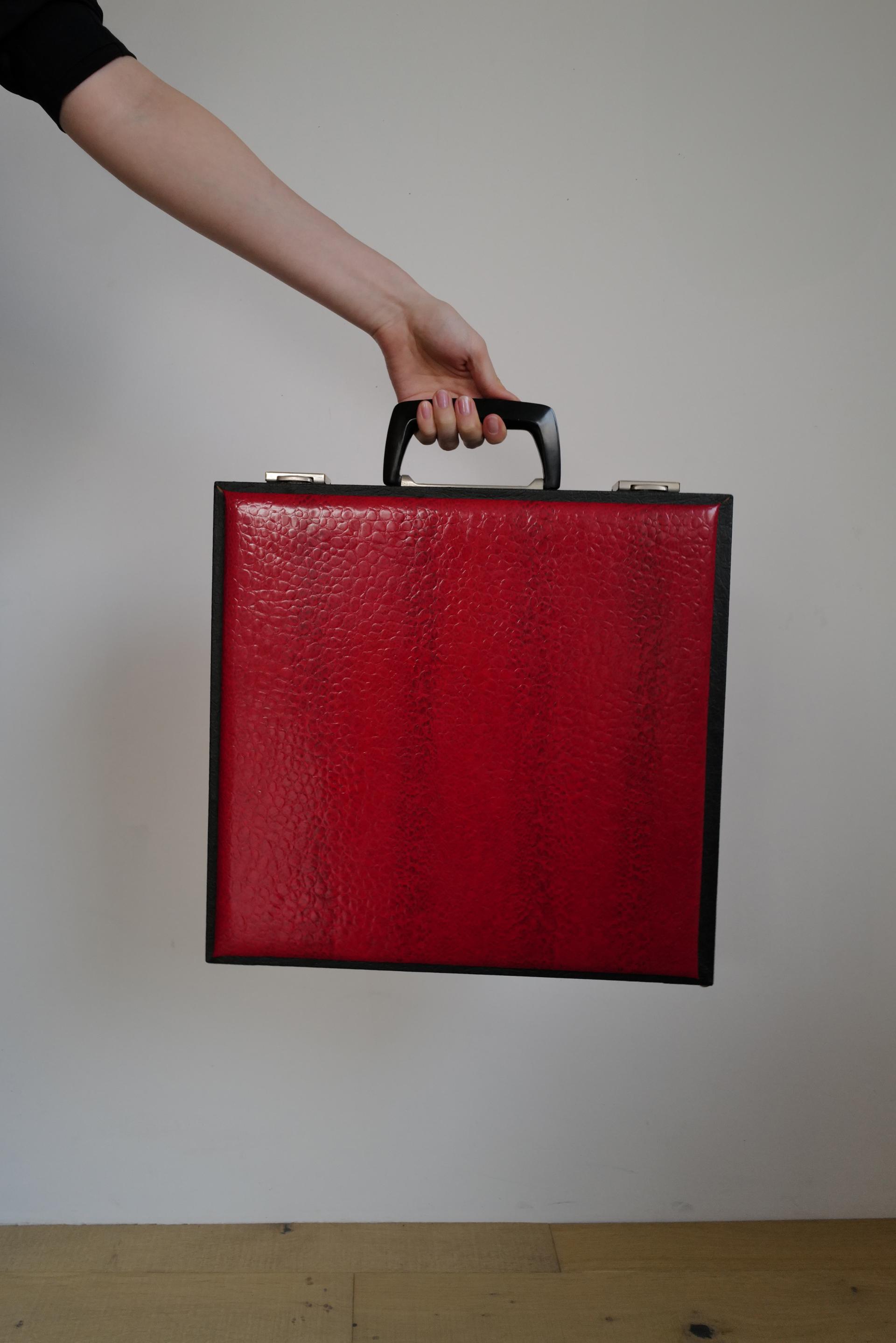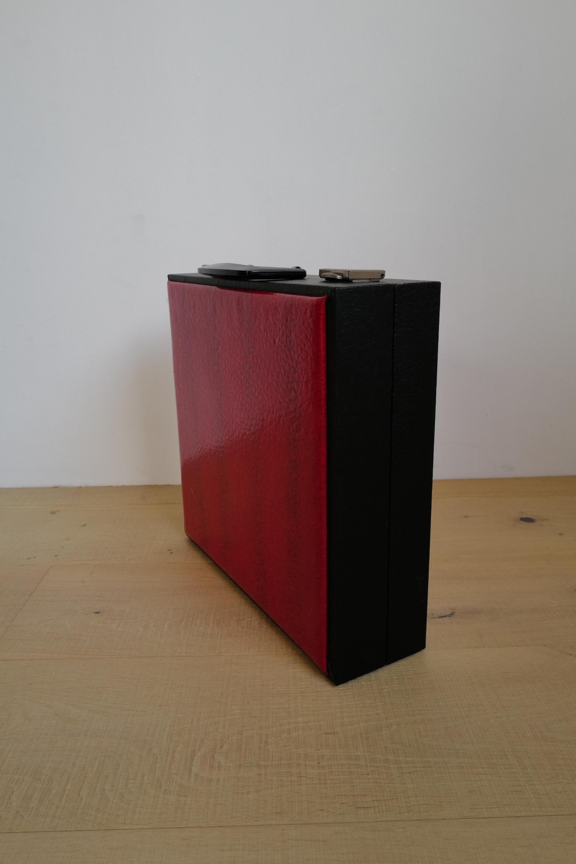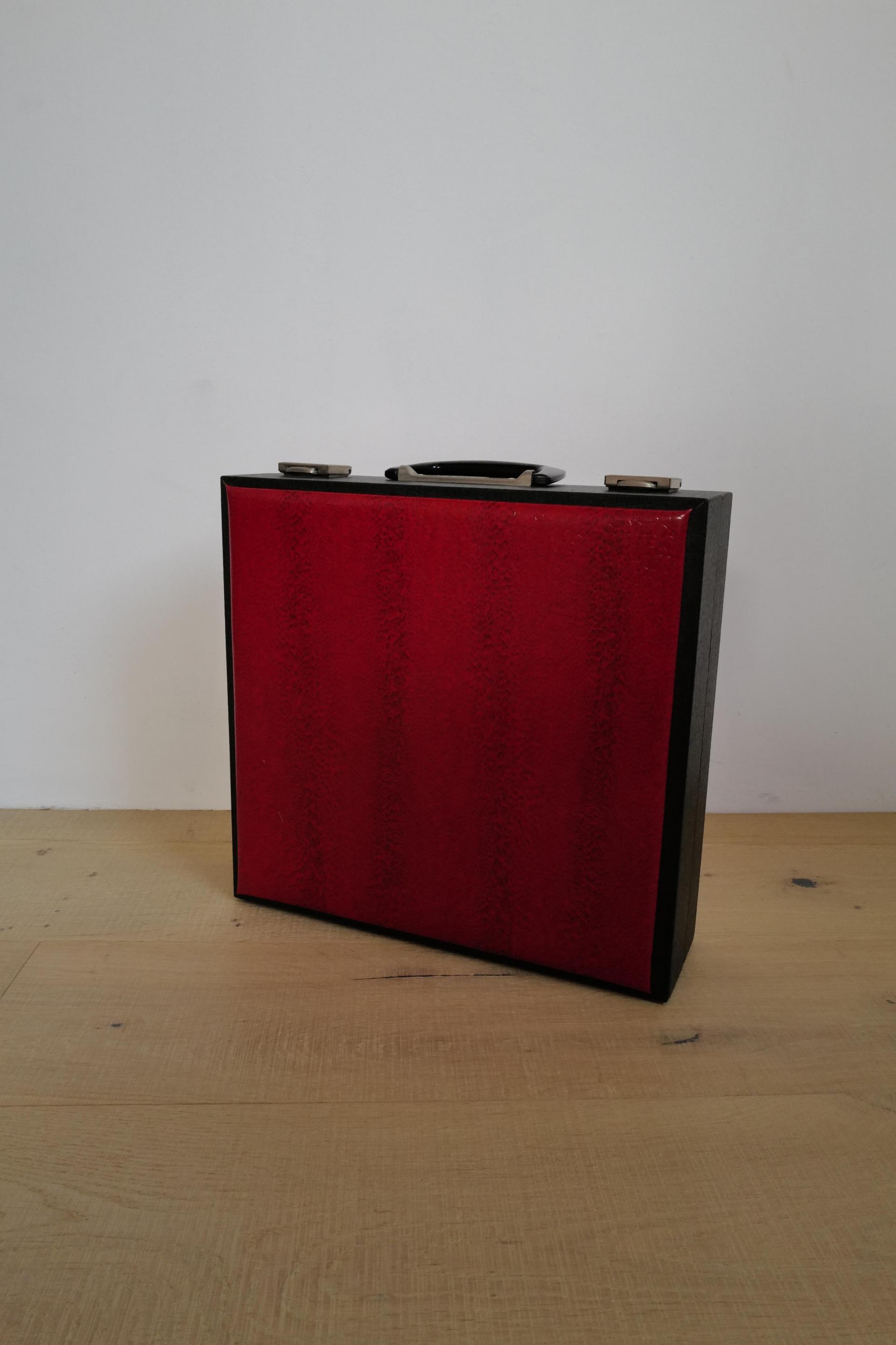 빨강과 검정 컬러의 모조가죽 외피로 마감되어 당시만의 감각적인 무드를 담고 있으며, 아코디언 타입의 구조로 최대 20장의 LP를 수납할 수 있습니다.