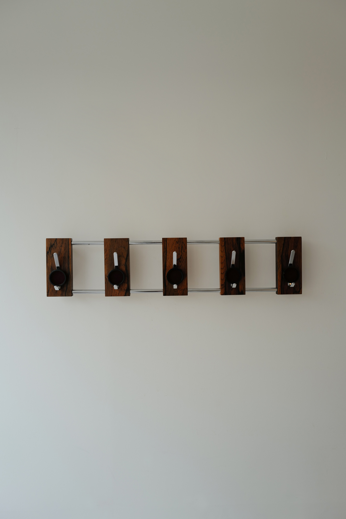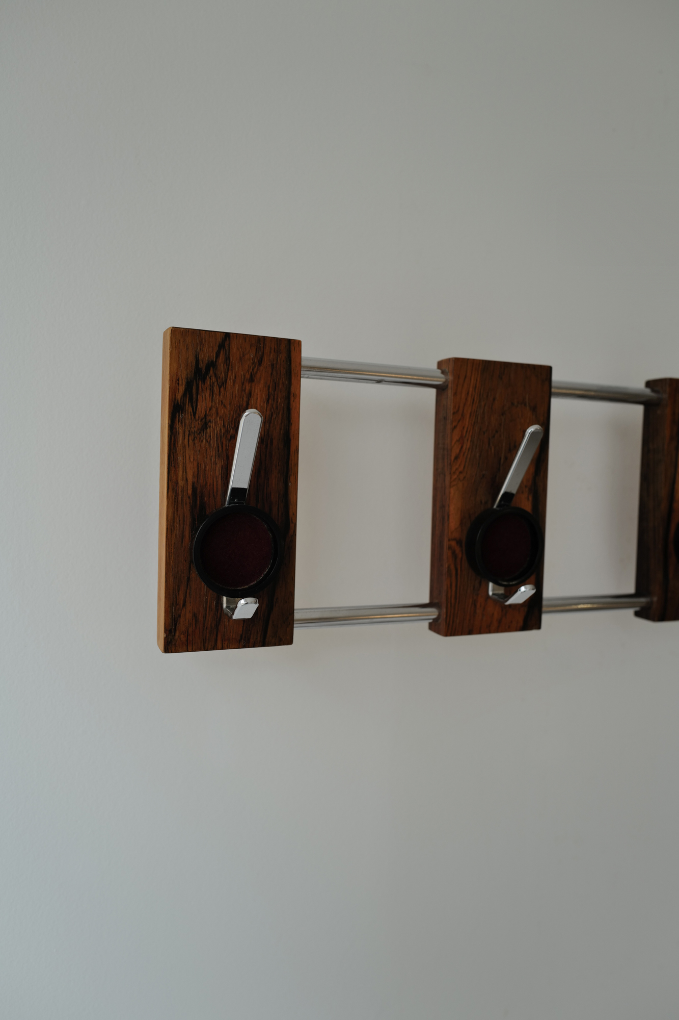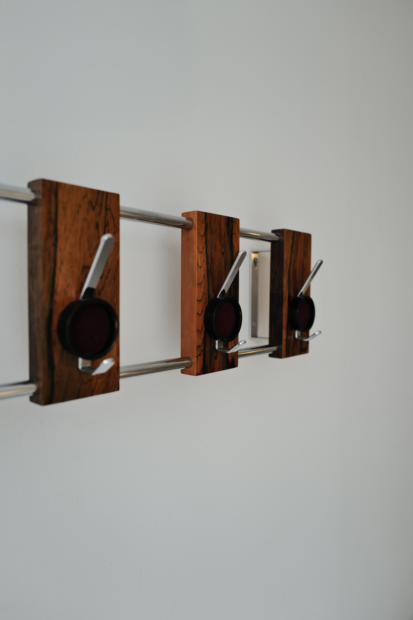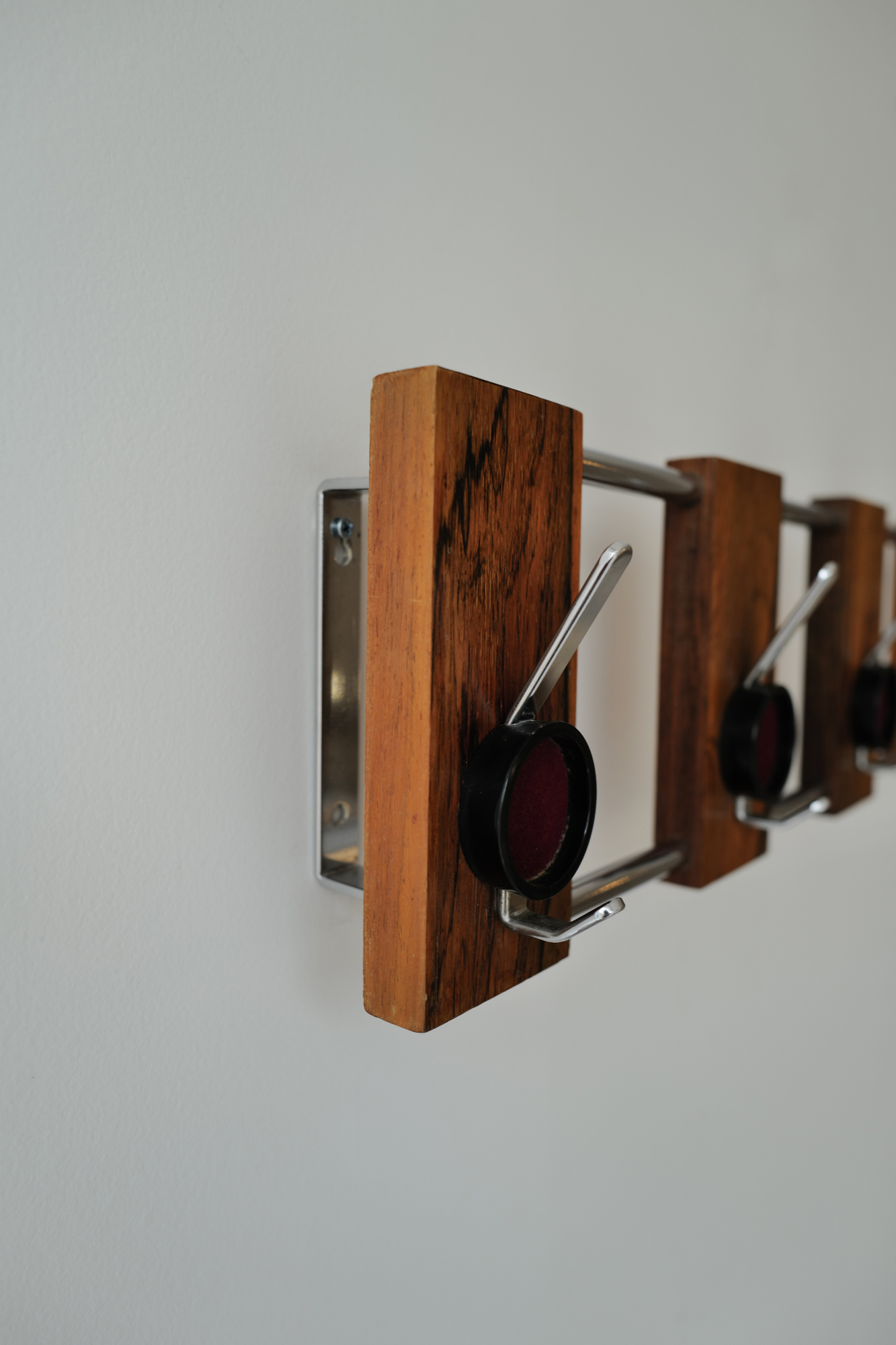 목재와 크롬, 그리고 둥근 레드 펠트 장식이 조화를 이루는 독특한 벽걸이 코트랙입니다.