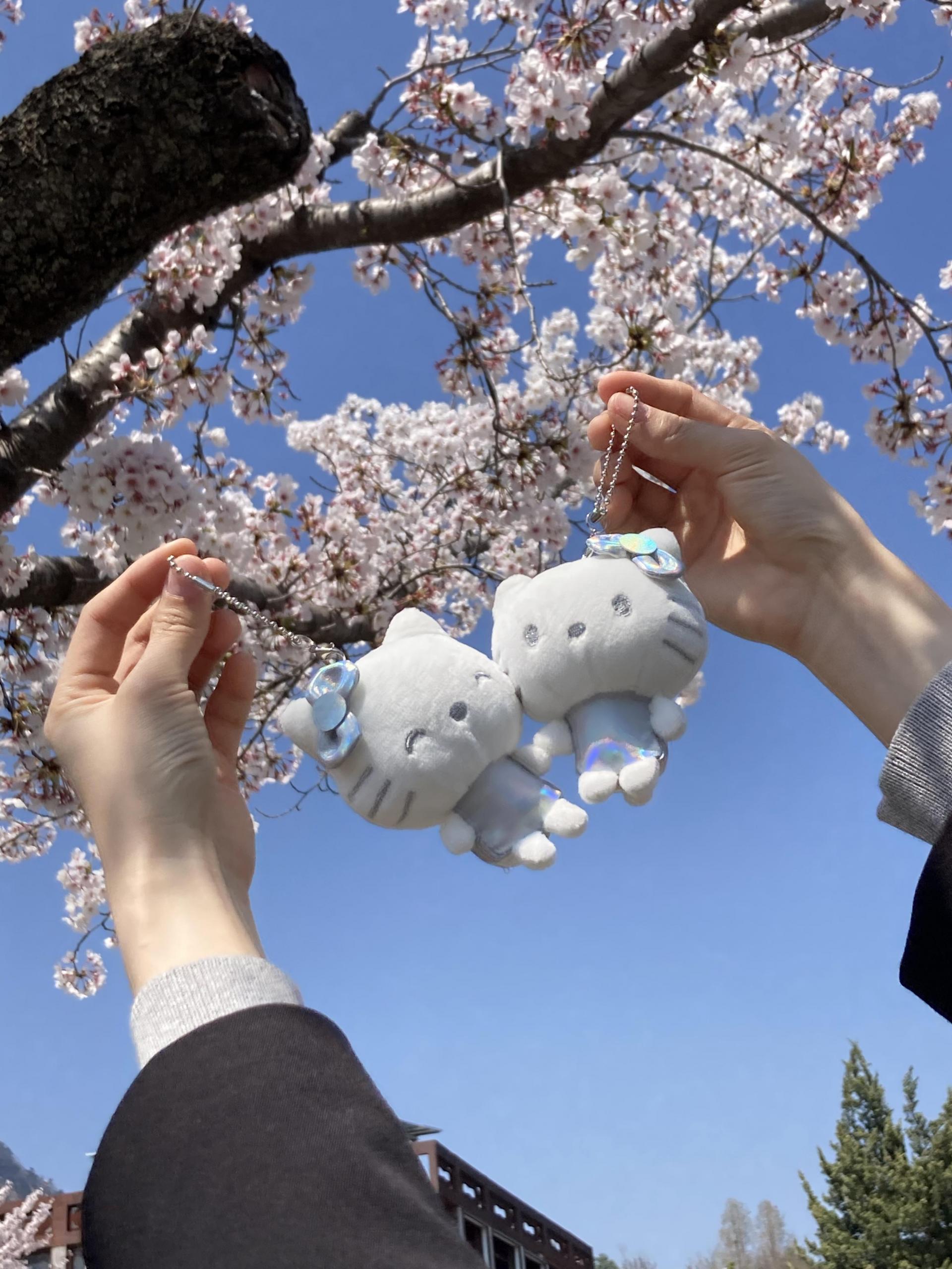 키티와 미미가 나란히 있는 한쌍이 세트 구성인 인형 키체인입니다.