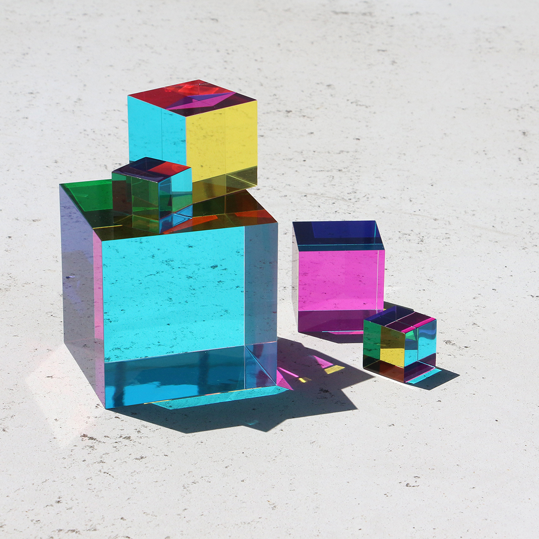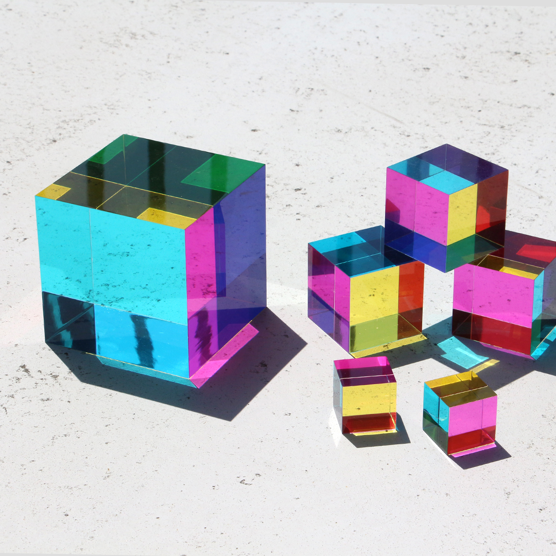 CMY(시안, 마젠타, 옐로우)의 원색을 사용해 큐브에 통과한 빛이 다양한 색을 재현하는 CMY 큐브.